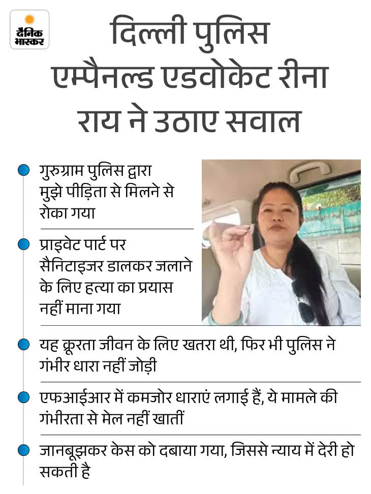 उधर, मामले में गुरुग्राम पुलिस की कार्यशैली पर भी सवाल उठाए गए है। मामले को हैंडल कर रही दिल्ली पुलिस इम्पैनल्ड एडवोकेट रीना राय ने कहा कि गुरुग्राम पुलिस ने उसे पीड़िता से मिलने से रोका। यह क्रूरता पीड़िता के जीवन के लिए खतरा थी, फिर भी हत्या का प्रयास नहीं माना गया।