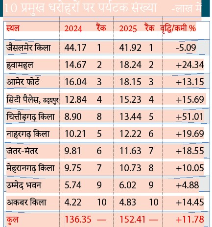 पर्यटन विभाग के जिला स्तरीय आंकड़ों के अनुसार प्रदेश में घरेलू पर्यटकों की औसत वृद्धि 9-10% रही, जबकि इन शीर्ष 10 स्थलों पर वृद्धि इससे अधिक दर्ज हुई। आंकड़े बताते हैं कि जयपुर आने वाला हर 8वां पर्यटक हवामहल और आमेर फोर्ट देखने गया, जबकि हर 12वां नाहरगढ़ फोर्ट और जंतर-मंतर पहुंचा।