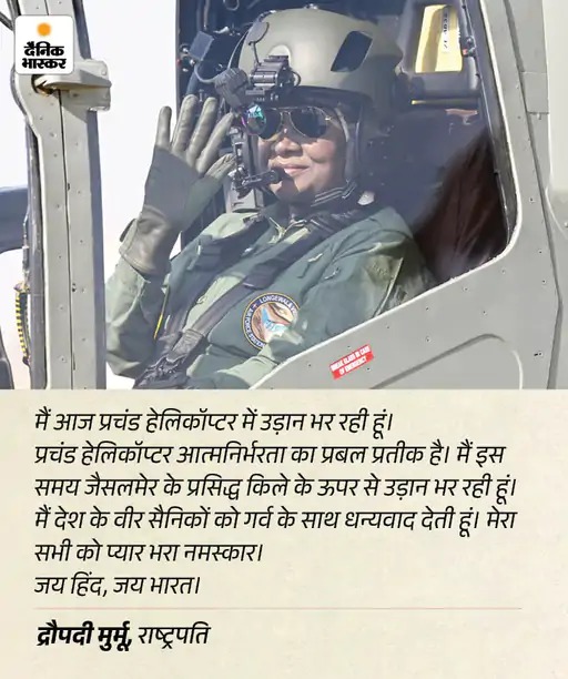 फाइटर हेलिकॉप्टर प्रचंड में उड़ान भरने वाली मुर्मू पहली राष्ट्रपति:कॉकपिट से देश को मैसेज-वीर सैनिकों को गर्व के साथ धन्यवाद; जय हिंद, जय भारत