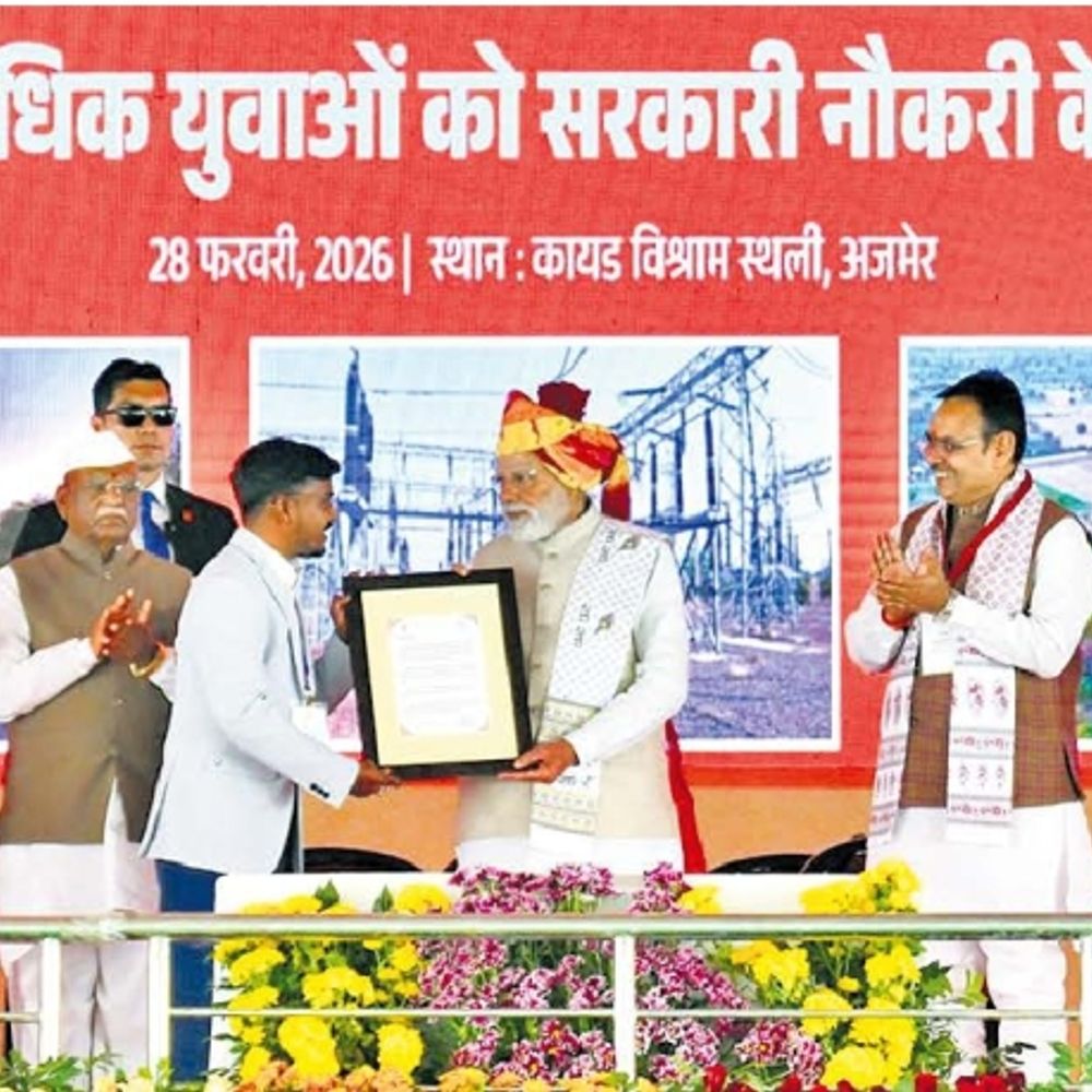 जयपुर| प्रधानमंत्री की सभा के दौरान मंच पर बाएं से मंत्री गजेंद्र सिंह खींवसर, डॉ. किरोड़ीलाल मीणा, डिप्टी सीएम दिया कुमारी, केंद्रीय मंत्री भागीरथ चौधरी, राज्यपाल हरिभाऊ बागडे, प्रधानमंत्री नरेंद्र मोदी, मुख्यमंत्री भजनलाल शर्मा, डिप्टी सीएम डॉ. प्रेमचंद बैरवा, सांसद व भाजपा प्रदेशाध्यक्ष मदन राठौड़, पूर्व सीएम वसुंधरा राजे व मंत्री राज्यवर्धन सिंह राठौड़। किसानों की बात: प्रधानमंत्री ने राजस्थान को विभिन्न जल योजनाओं से जोड़ने का जिक्र किया। इस जिक्र के जरिए पीएम मोदी ने कांग्रेस पर सवाल उठाए और केंद्र की योजनाओं की जानकारी देकर किसानों को साधने का प्रयास किया। उन्होंने संशोधित पार्वती-काली सिंध-चंबल लिंक परियोजना, यमुना राजस्थान लिंक प्रोजेक्ट सहित अन्य सिंचाई परियोजनाओं का लाभ किसानों तक पहुंचाने के लिए प्रतिबद्धता दर्शाई। पीएम नरेंद्र मोदी ने अपने 32 मिनट के भाषण में महिलाओं, किसानों, युवाओं सहित हर वर्ग को शामिल करते हुए राजस्थान में ईआरसीपी से लेकर वन रैंक-वन पेंशन और पीएम सूर्य घर योजना तक का उल्लेख करते हुए सभी को साधने की कोशिश की। पीएम ने 21,800 युवाओं को नियुक्ति पत्र बांटे। राजे को बहन कह संबोधित किया प्रधानमंत्री ने भजनलाल शर्मा को लोकप्रिय मुख्यमंत्री, पूर्व मुख्यमंत्री वसुंधरा राजे को बहन कहकर संबोधित किया। प्रधानमंत्री ने राज्यपाल हरिभाऊ बागड़े, केन्द्रीय मंत्री भागीरथ चौधरी, उप मुख्यमंत्री दिया कुमारी, प्रेमचंद बैरवा, संसद में मेरे साथी भाजपा प्रदेशाध्यक्ष मदन राठौड़ तथा अन्य मंत्रियों का जिक्र किया। सभा में शामिल हुए संतों का आशीर्वाद लिया। वन रैंक वन पेंशन: वन रैंक वन पेंशन के जरिए कांग्रेस पर निशाना साधा, कहा कांग्रेस ने सेना को वर्दी और हथियारों के लिए भी तरसा दिया था। वन रैंक वन पेंशन का मुद्दा राजस्थान के झुंझुनूं से ही उठा था। सेना को सर्वाधिक युवा देने वाले राज्यों में राजस्थान भी शामिल हैं। पेपर लीक और रोजगार की बात : प्रधानमंत्री ने युवाओं को साधने के लिए रोजगार की बात की। नियुक्ति पत्र भी बांटे। साथ ही पेपर लीक के जरिए कांग्रेस सरकार की नाकामियों को गिनाया। साथ ही भाजपा सरकार के दो वर्षों में हुई परीक्षाएं बगैर लीक हुए कराने का भी संदेश युवा वर्ग को दिया। रूफ टॉप सोलर प्लांट पीएम सूर्य घर योजना के जरिये मध्यमवर्गीय परिवारों को बिजली बिल से राहत मिलने का संदेश दिया। इससे घर बैठे बिजली से कमाई और सरकार की ओर से मिलने वाली सब्सिडी का भी जिक्र किया गया। योजना का स्टेटस : देश भर में फरवरी 2026 तक करीब 35 लाख और राजस्थान में करीब 1.48 लाख सोलर इंस्टॉलेशन हो चुके हैं।