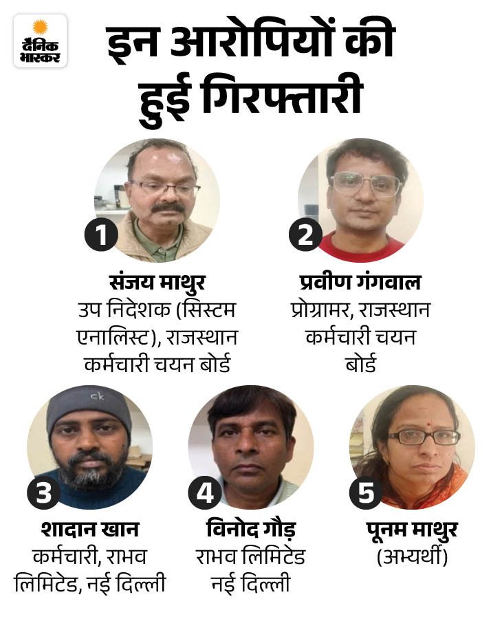 एसओजी ने 5 आरोपियों को किया था गिरफ्तार SOG ने 20 जनवरी को बड़ी कार्रवाई को अंजाम देते हुए OMR शीट में नंबर बढ़ाने वाली गैंग का खुलासा किया था। RSSB के तकनीकी प्रमुख संजय माथुर सहित प्रवीण गंगवाल, शादान खान, विनोद कुमार गौड़ और पूनम माथुर को अरेस्ट किया था। प्रवीण गंगवाल राजस्थान कर्मचारी चयन बोर्ड जयपुर में प्रोग्रामर है। दोनों आरोपी पूरी OMR शीट्स की स्कैनिंग और रिजल्ट तैयार करने की प्रक्रिया के प्रभारी थे। इन दोनों ने आउटसोर्स फर्म के कर्मचारी शादान खान और विनोद कुमार गौड़ के साथ मिलीभगत की। इस तरह 38 लोगों की नौकरी लगवाई गई।
