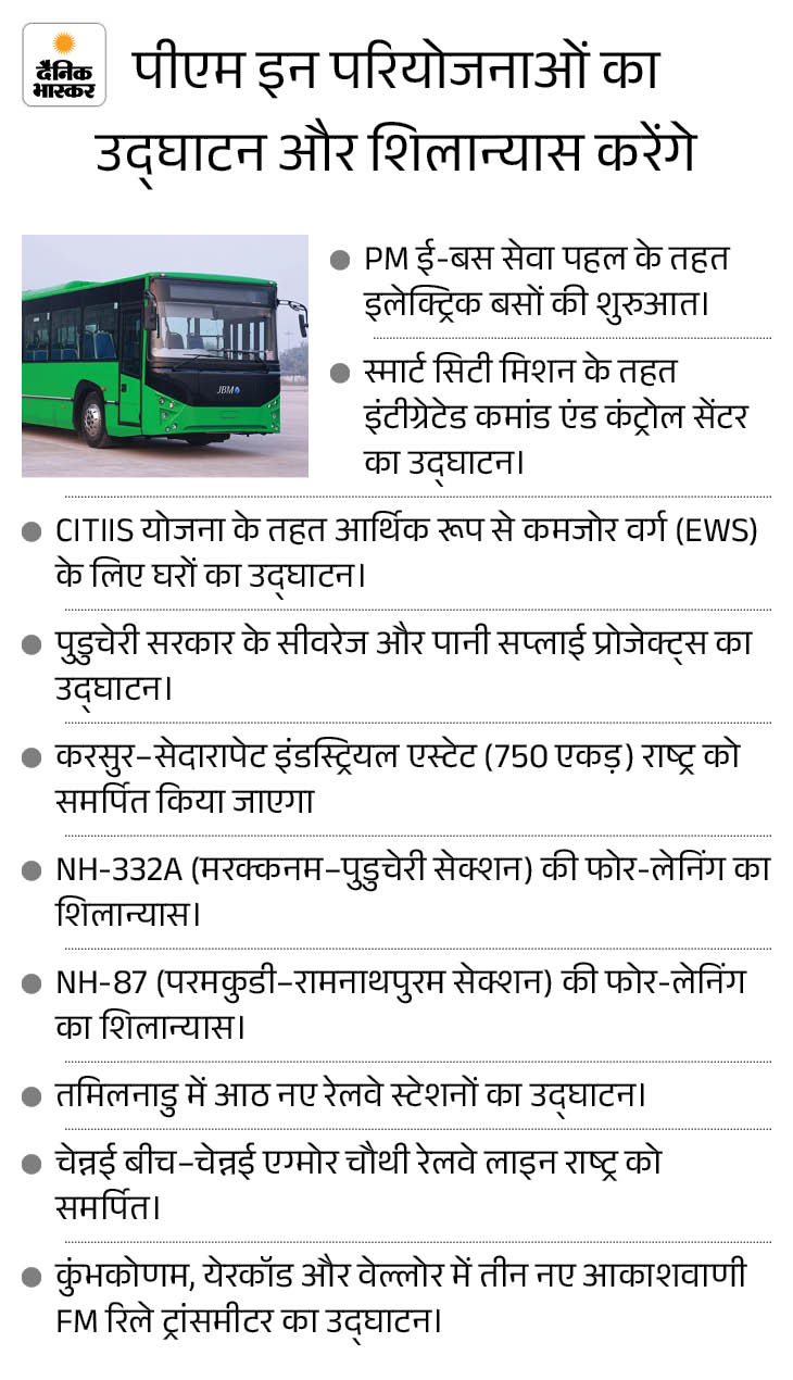 NH-332A के मरक्कनम-पुडुचेरी सेक्शन और NH-87 के परमकुडी-रामनाथपुरम सेक्शन की फोर-लेनिंग का दोपहर करीब 3 बजे आधारशिला रखेंगे। पीएम कुंभकोणम, येरकॉड और वेल्लोर में तीन नए आकाशवाणी FM रिले ट्रांसमीटर का उद्घाटन भी करेंगे।