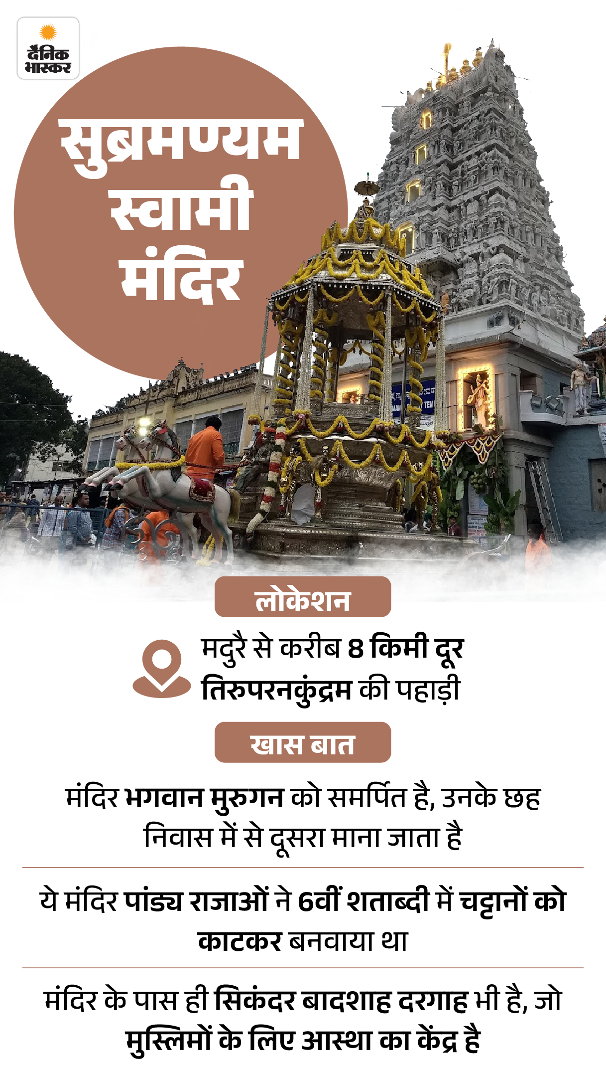 तमिलनाडु के मदुरै से 10 किमी दूर दक्षिण में तिरुप्परनकुंड्रम शहर है। इसे भगवान मुरुगन के 6 निवास स्थानों में से एक माना जाता है। यहां की तिरुप्परनकुंड्रम पहाड़ी पर सुब्रमण्य स्वामी मंदिर है, जो छठी शताब्दी का माना जाता है।