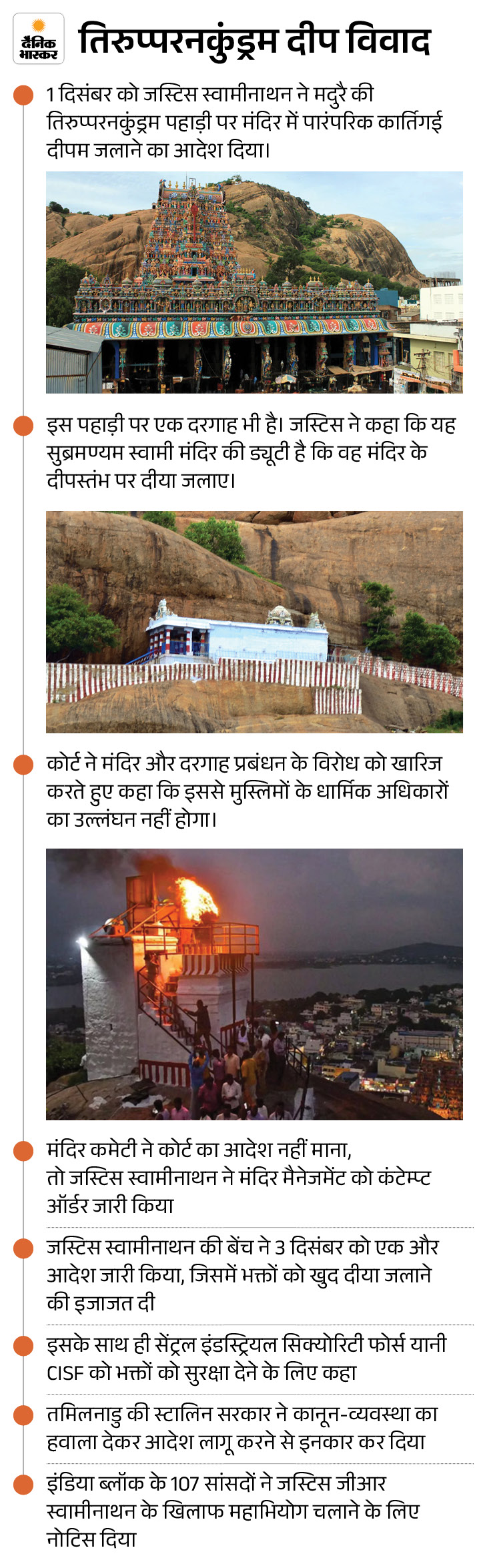 तमिलनाडु के मद्रास हाईकोर्ट की मदुरै बेंच ने 6 जनवरी को तिरुप्परनकुंड्रम मंदिर में पहाड़ी पर दरगाह के पास दीपस्तंभ (दीपथून) पर दीप जलाने की इजाजत दे दी है। जस्टिस जी जयचंद्रन और जस्टिस केके रामकृष्णन की बेंच ने जस्टिस जी.आर. स्वामीनाथन के सिंगल बेंच का फैसला बरकरार रखा।