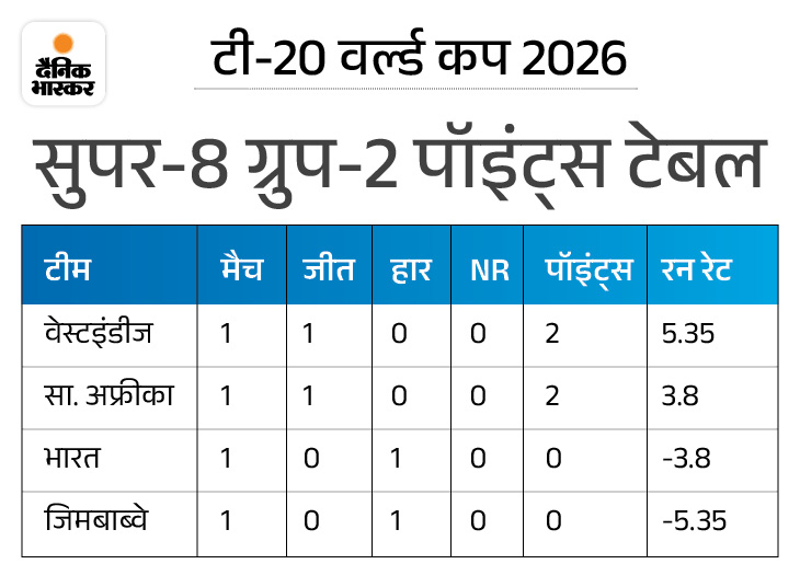 वेस्टइंडीज ने सोमवार को टी-20 वर्ल्ड कप में सुपर-8 के अपने पहले मुकाबले में जिम्बाब्वे को 107 रन से हरा दिया। इस जीत ने भारत की परेशानी बढ़ा दी है। भारतीय टीम साउथ अफ्रीका के खिलाफ अपने पहले मैच में 76 रन से हार गई थी। ग्रुप की टॉप-2 टीम को ही सेमीफाइनल में जगह मिलेगी। समझिए, भारत को सेमीफाइनल में एंट्री कैसे मिलेगी… पूरी खबर